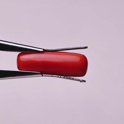This is a premium-quality Italian Red Coral (Moonga) weighing 7.87 Carat, crafted in a smooth and elegant capsule shape. The stone has a bright, uniform red colour with a glossy polish, giving it a rich and attractive appearance.